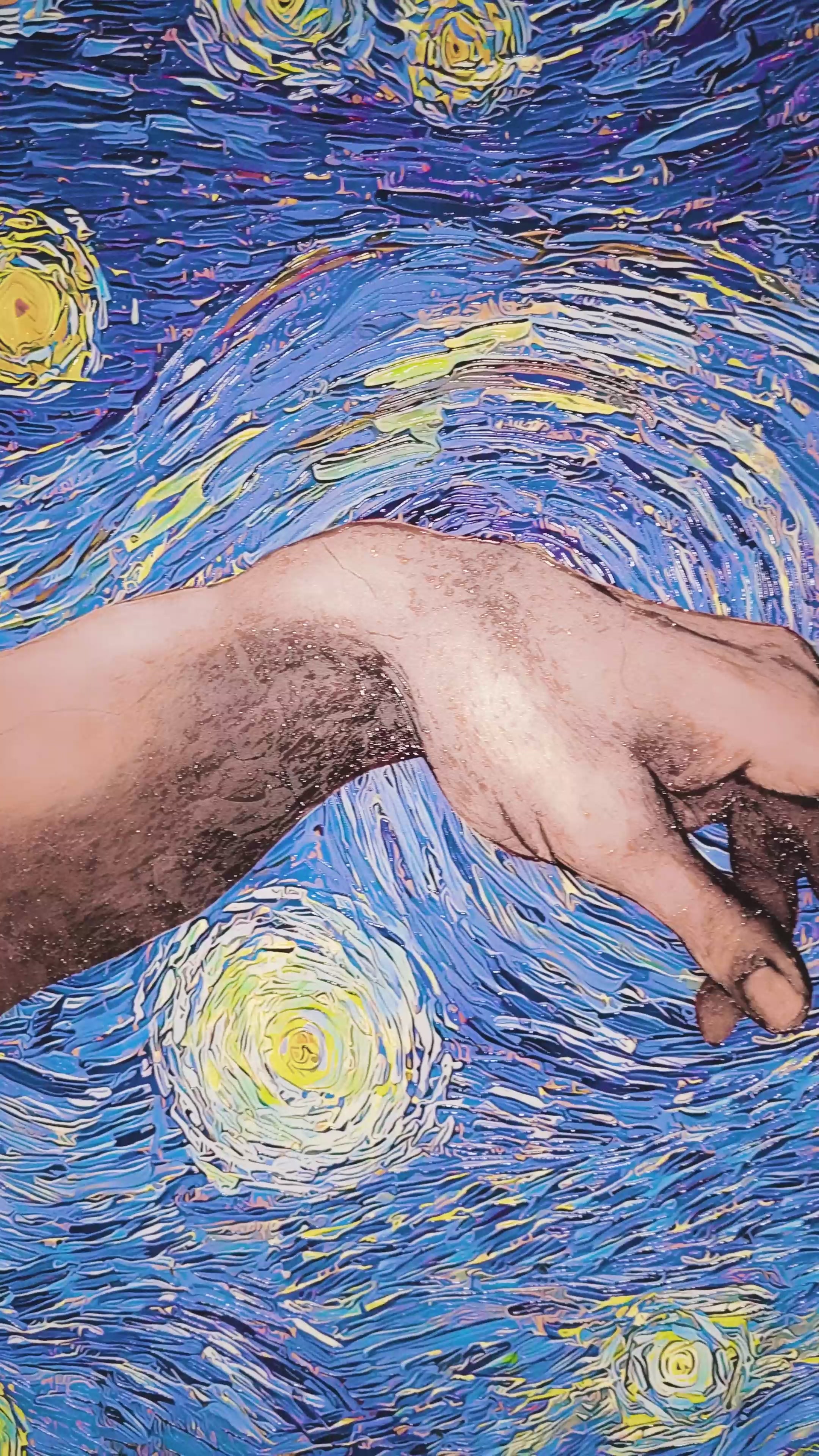 | Texture | Raised Surface (Heavy relief on hands, stars, and impasto swirls) |