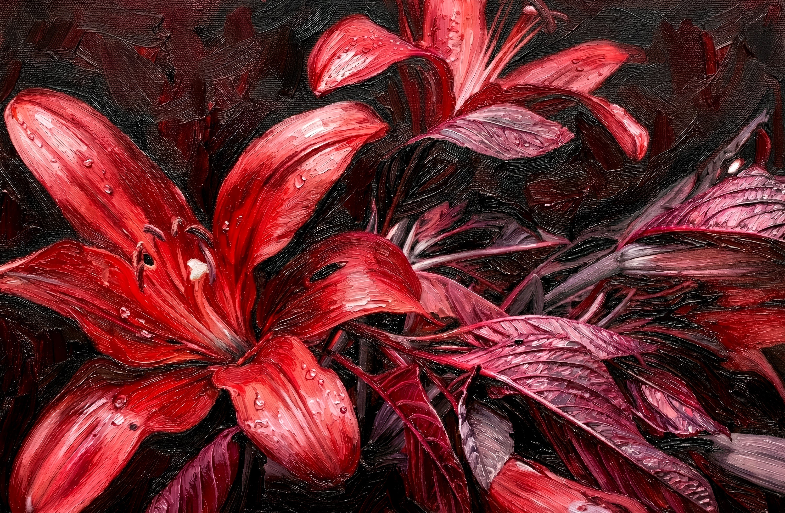 Not just a floral masterpiece—a physical eruption of scarlet elegance. Crimson Velvet Lilies captures the raw, dramatic beauty of deep red blooms through heavy, palette-knife fırça strokes. Utilizing our proprietary 3D haptic embossing, the artwork is transformed into a tangible landscape of passion, where the sculpted petals rise from the dark void to command your space.