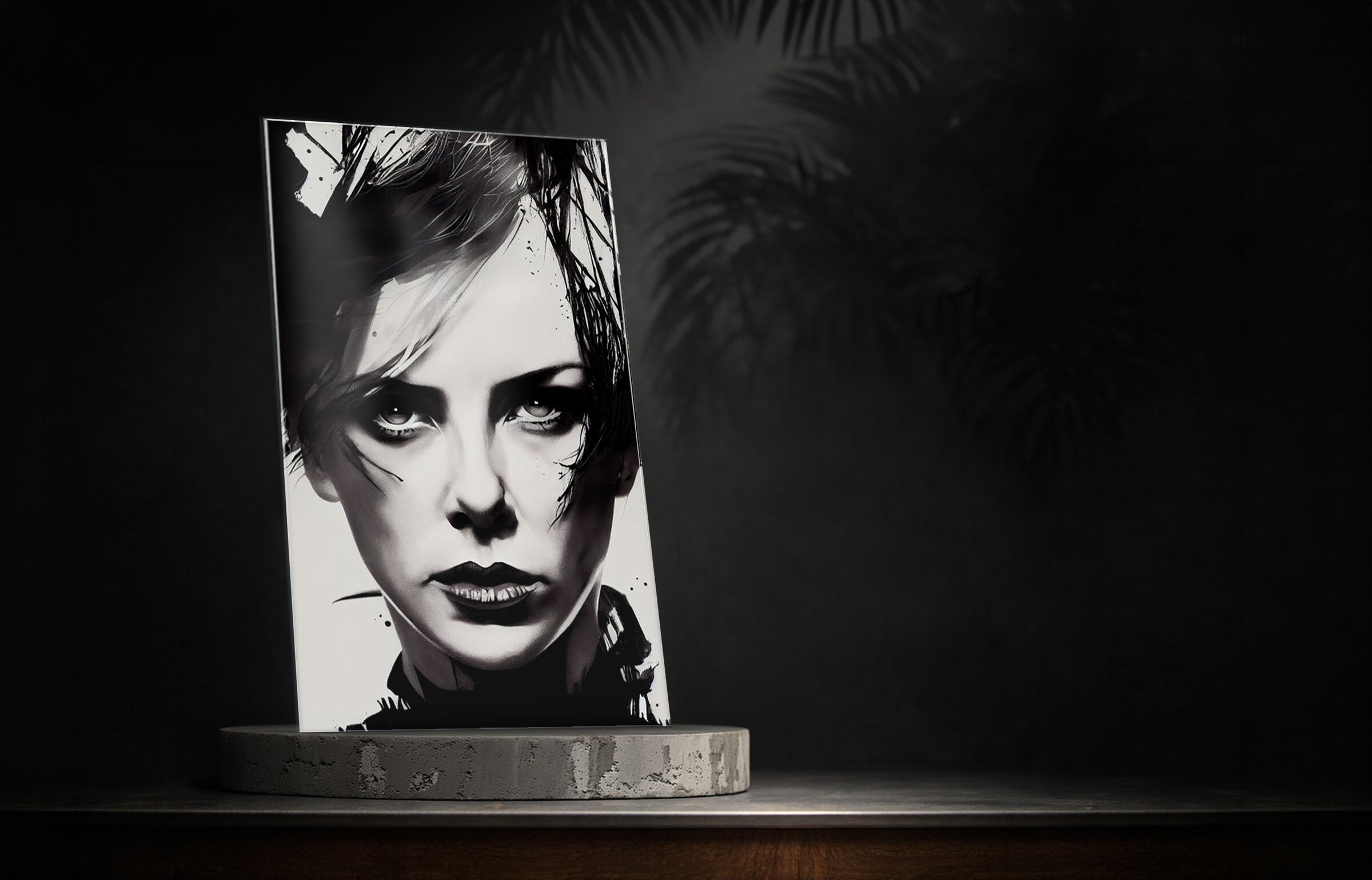 A dramatic digital artwork that holds the eye — The Bellicose is printed behind 4mm tempered glass at 1200 dpi, where balanced shadows gain a luminous depth only glass can deliver. Mounted on a hidden steel floating system, it lifts 2 cm off the wall — casting a natural shadow line that makes the piece appear weightless. Ideal for a living room or home office. Part of the Designer Collection — designed to be the centerpiece of a room, not just decoration.
