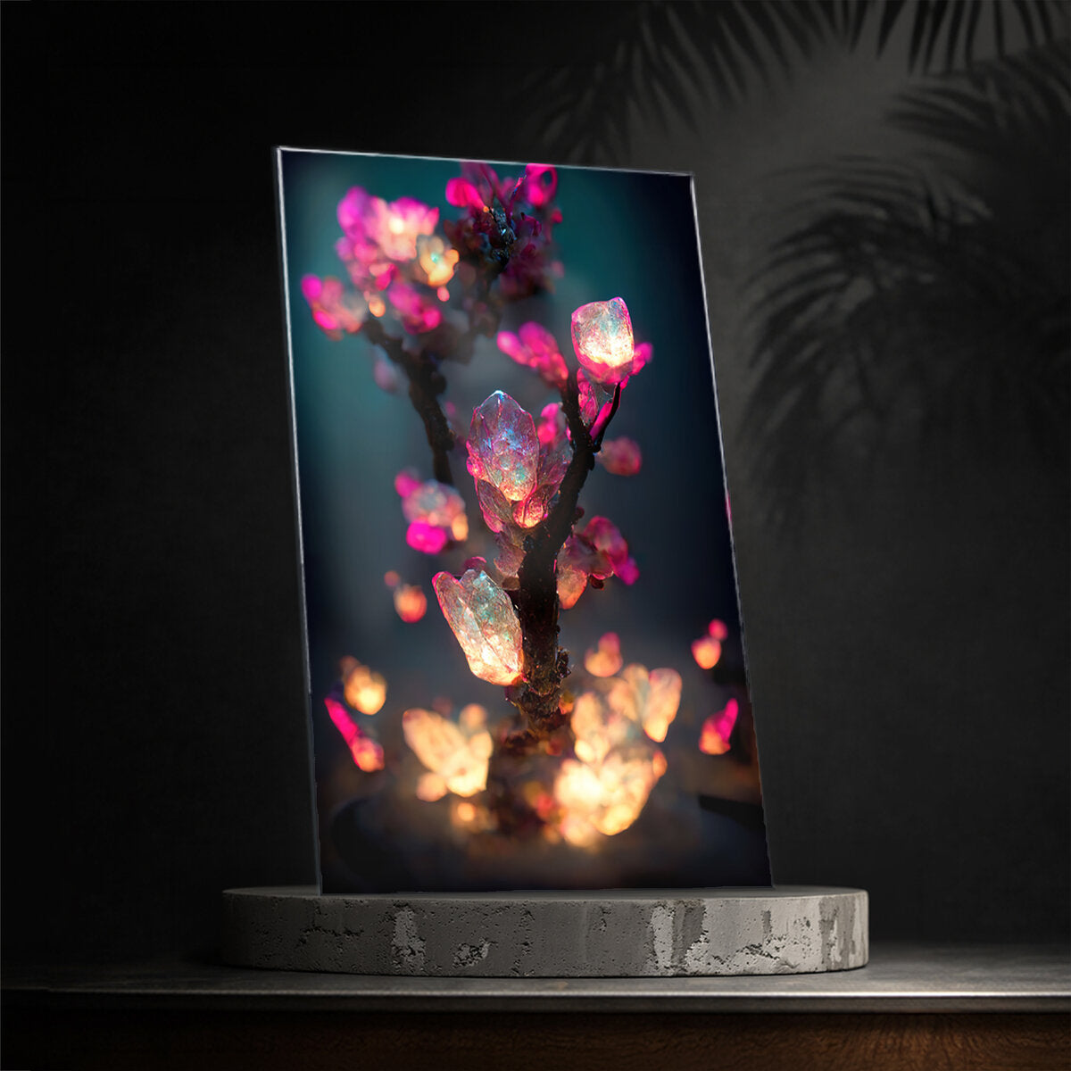 A dramatic digital artwork that holds the eye — Fire Blooms Glass Art is printed behind 4mm tempered glass at 1200 dpi, where richly dark shadows gain a luminous depth only glass can deliver. A concealed steel mount holds it 2 cm from the wall, creating a floating shadow gap that adds architectural dimension. Best suited for a living room or bedroom. Part of the Designer Collection — designed to be the centerpiece of a room, not just decoration.