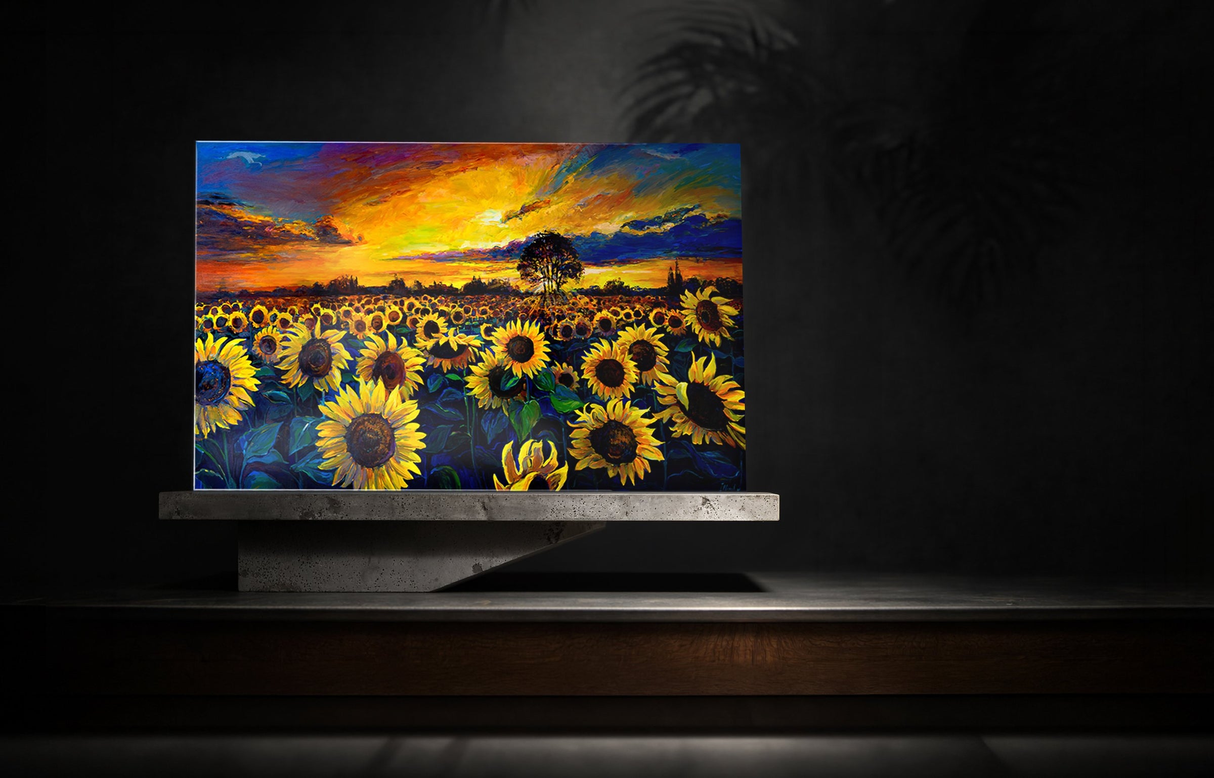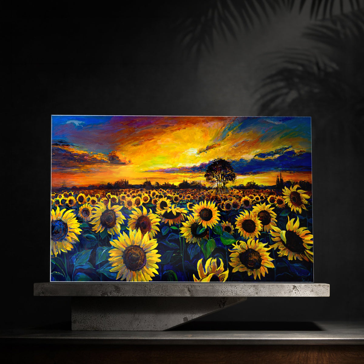 This product is not a digital screen but a modern artwork produced with high-resolution printing. It does not feature motion or sound, but permanently showcases the vivid colors of the design and the elegance of glass in your space.