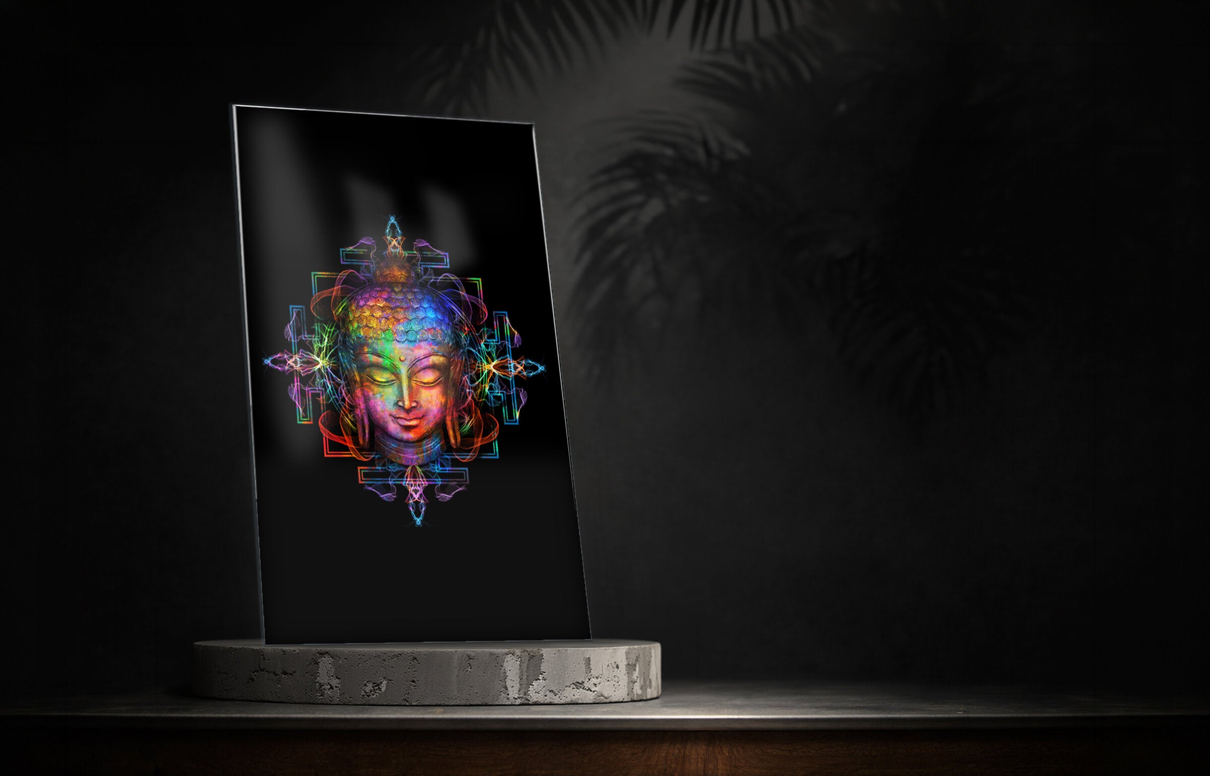 Inspired by the calm wisdom of the Buddha, Buddha brings bold presence to your walls, alive with blue, yellow, orange and red accents. Rooted in modern design, every detail serves the overall composition. Produced on 3/16" (4 mm) tempered glass with DURST UV printers, delivering museum-grade color depth behind a smooth, polished glass surface. A hidden steel mount holds it 3/4" (2 cm) off the wall, creating an elegant floating effect. An effortless statement piece for your bedroom. Tempered for 5x the strength of standard glass. UL GREENGUARD Gold certified — safe for any room.