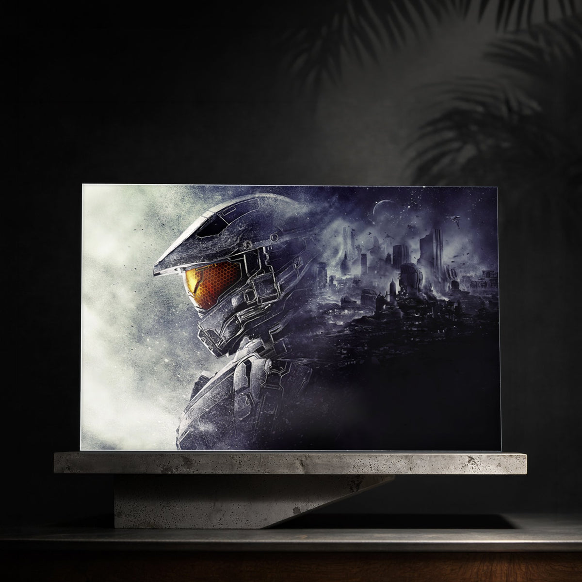 Bring cosmic depth and mystery into your space with Halo - Master Chief, drawing from a palette of black, orange, charcoal and gray. Rooted in abstract design, it adds artistic depth to any setting. Produced on 3/16" (4 mm) tempered glass with DURST UV printers, delivering museum-grade color depth behind a smooth, polished glass surface. Included steel hardware suspends the piece 3/4" (2 cm) from the wall for a modern floating look. An effortless statement piece for your executive office. 5x stronger than regular glass and UL GREENGUARD Gold certified for indoor air quality.