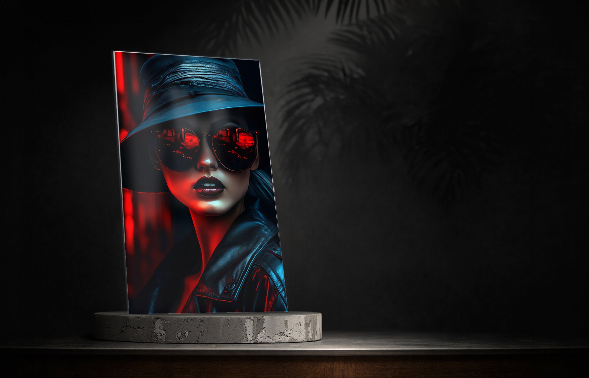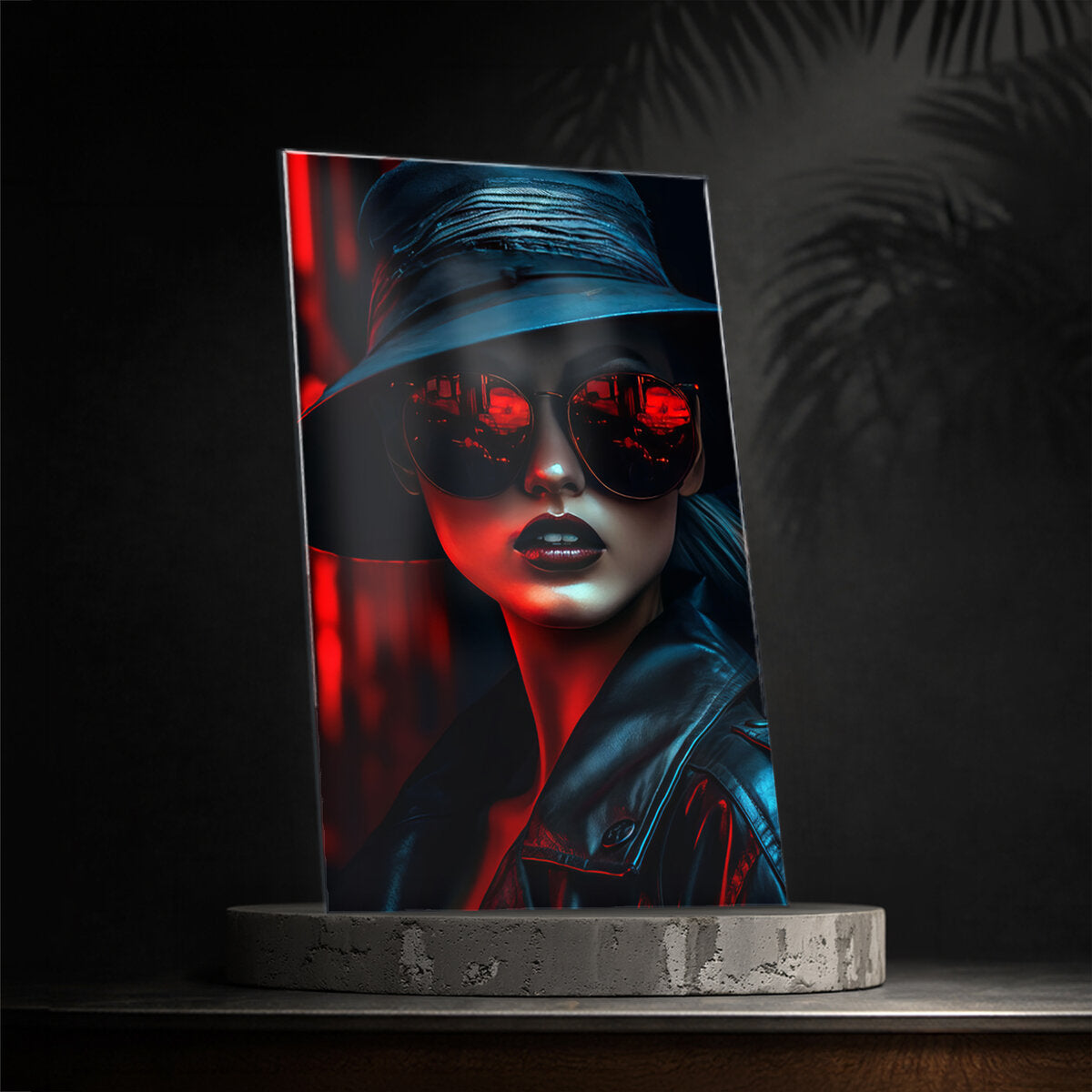Dark, dramatic, and unmistakable โ Style and Woman is a digital artwork reverse-printed on 4mm tempered glass, its blue, neon, and deep palette glowing from within the glass itself. Mounted on a hidden steel floating system, it lifts 2 cm off the wall โ casting a natural shadow line that makes the piece appear weightless. Ideal for a personal den or entertainment room. Part of the Designer Collection.