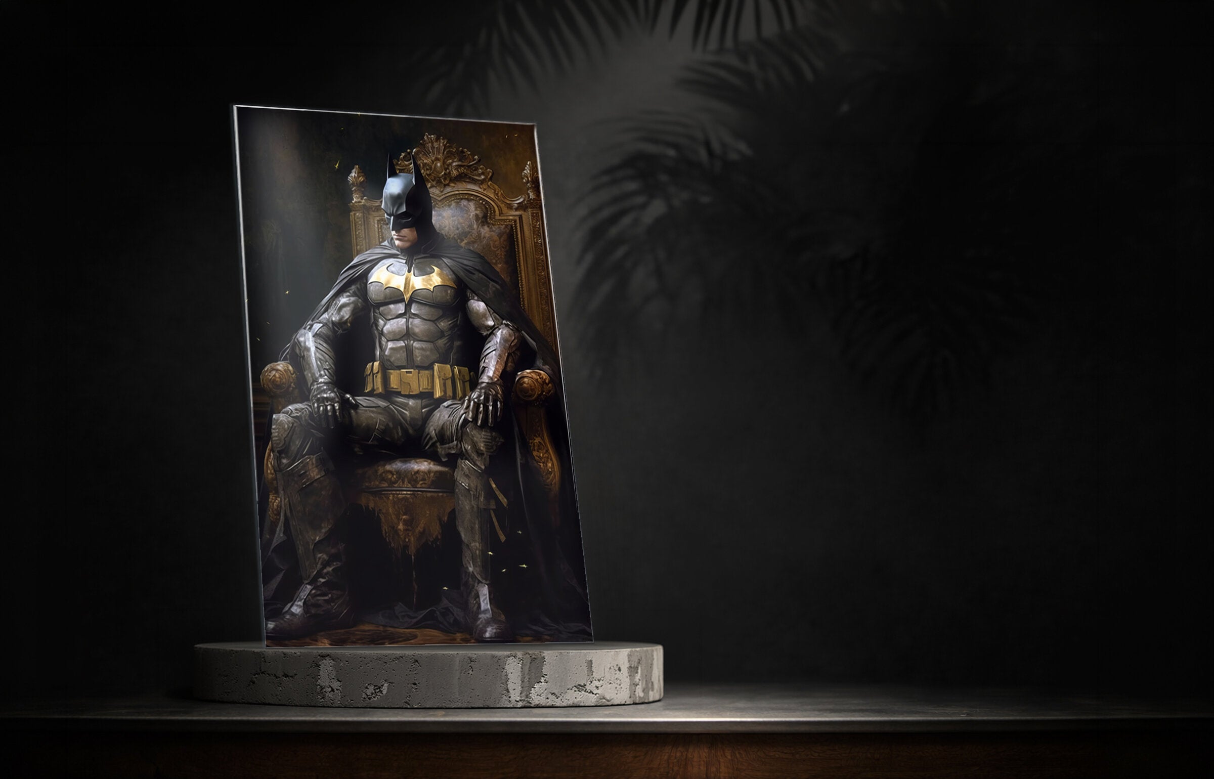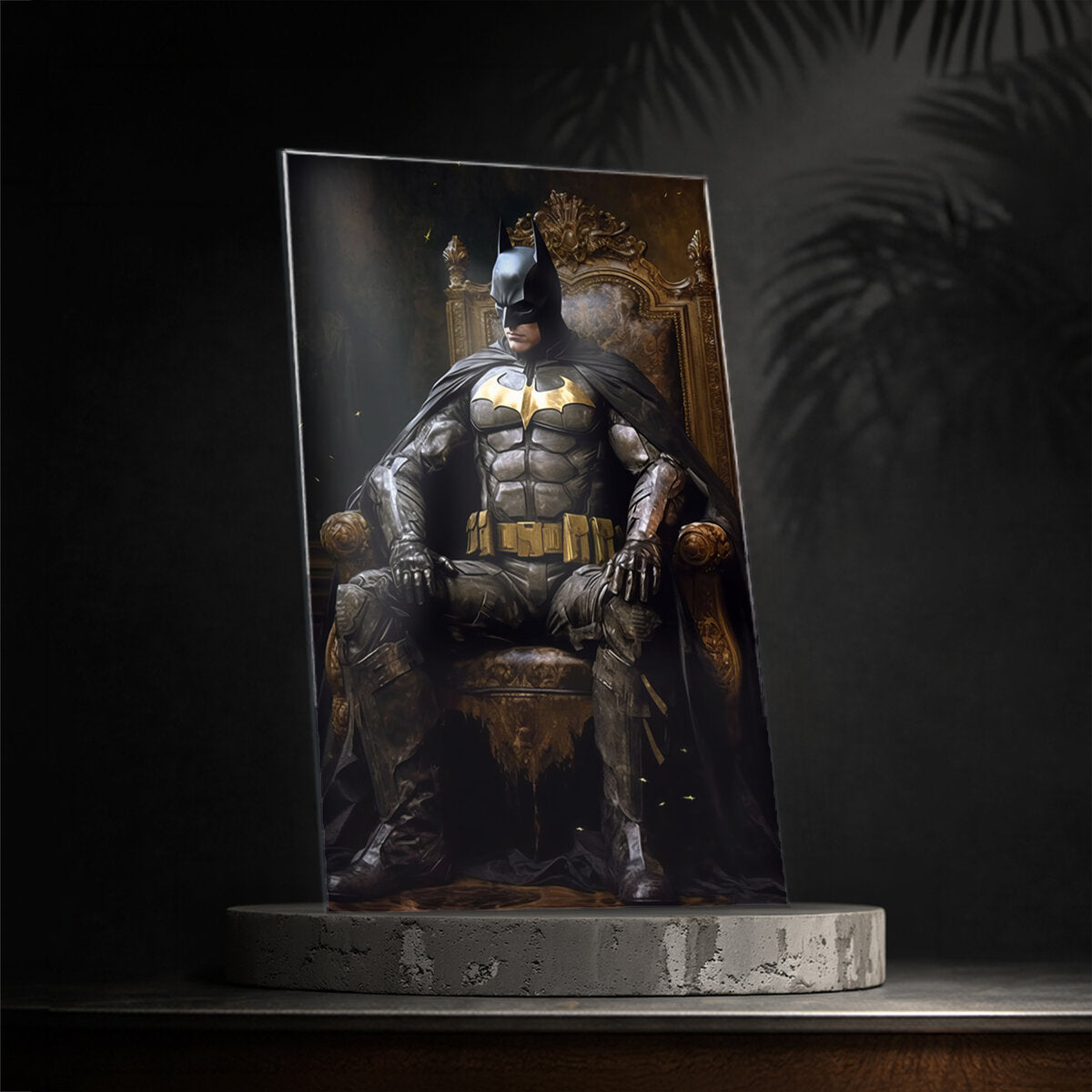 Batman in the Throne brings a legendary silhouette to your wall โ this dramatic digital artwork is reverse-printed on 4mm tempered glass, where black, grey, and deep hues glow from within the glass itself. The hidden steel mount suspends the glass 2 cm off the wall, producing a subtle shadow line that changes with daylight. A natural fit for a entertainment room or personal den. Part of the Designer Collection โ crafted for spaces where art is meant to be lived with.