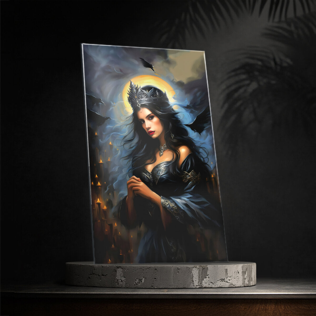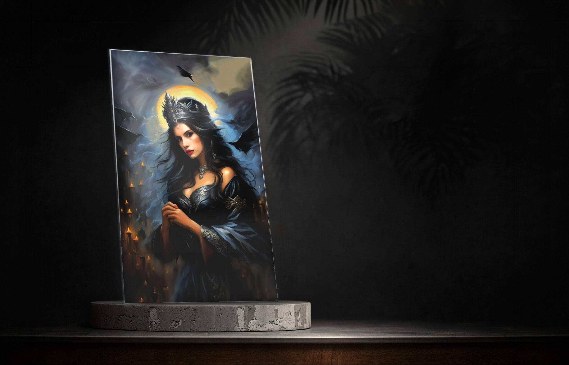 Dark Queen commands attention — a mysterious illustration in richly dark tones, UV-printed from behind 4mm tempered glass where every detail is sealed beneath a flawless, polished surface. Mounted on a hidden steel floating system, it lifts 2 cm off the wall — casting a natural shadow line that makes the piece appear weightless. Ideal for a teen_room or gallery wall. An Insigne exclusive — designed to be the centerpiece of a room, not just decoration.